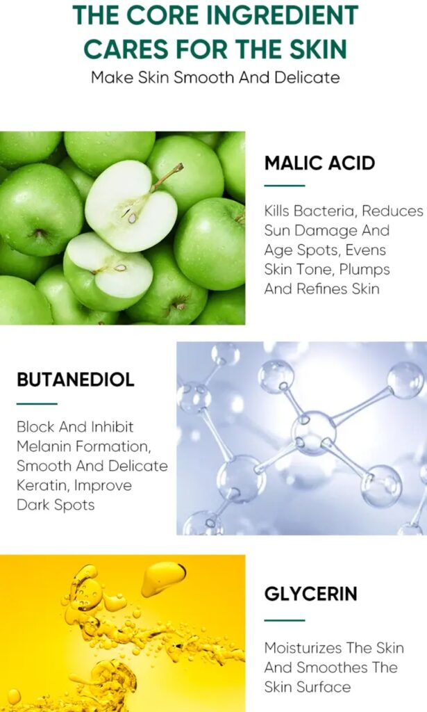 Specially added Malic Acid which helps to reduce sun damage and age spots, rich in antioxidants that help protect the skin from environmental stressors, reduce oxidative stress, and promote overall skin health.